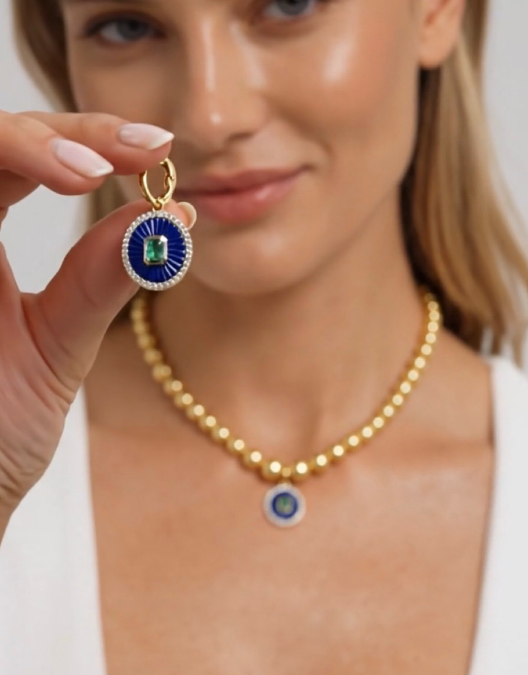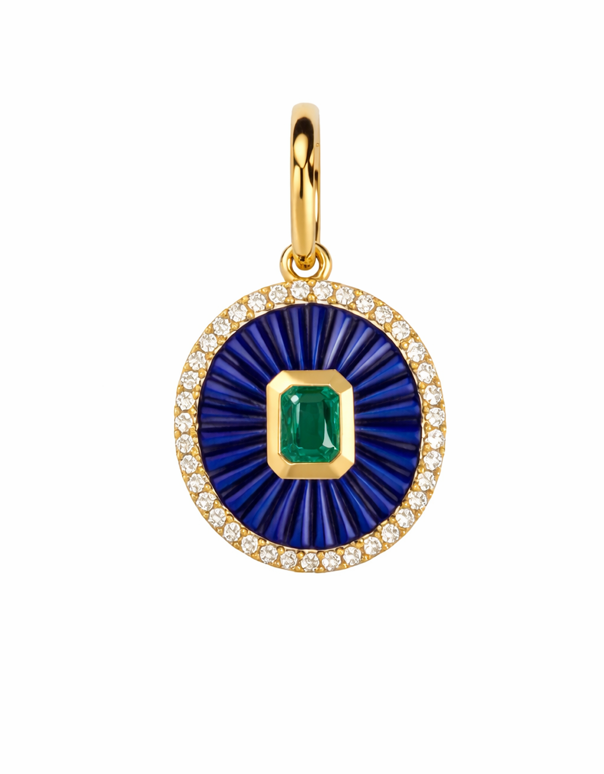 1.5 carat emerald is set on intricately carved lapis, surrounded by 42 melee diamonds. Set in 14kt yellow gold the bail is large enough to slide onto most chains AND the bail opens and securely closes, to attach to any of your existing chains.